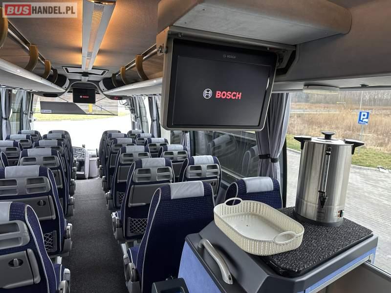 Wyposażenie: klimatyzacja, video, WC, lodówka, caffebar, kabina sypialna, oświetlenie indywidualne, nawiewy dyszowe, fotele odchylane, podnóżki, stoliczki, siateczki, ABS, ASR, tempomat, retarder, telefon, nawigacja, CD, mikrofon, radio, fotele odchylane i rozsuwane, kuchenka mikrofalowa, wyświetlacz matrix, sejf, regulacja wysokości nadwozia, centralny zamek, podwójne szyby boczne, wspomaganie kierownicy, aluminiowe felgi, elektryczne lusterka, ogrzewanie stacjonarne, DVD, hak holowniczy, ESP